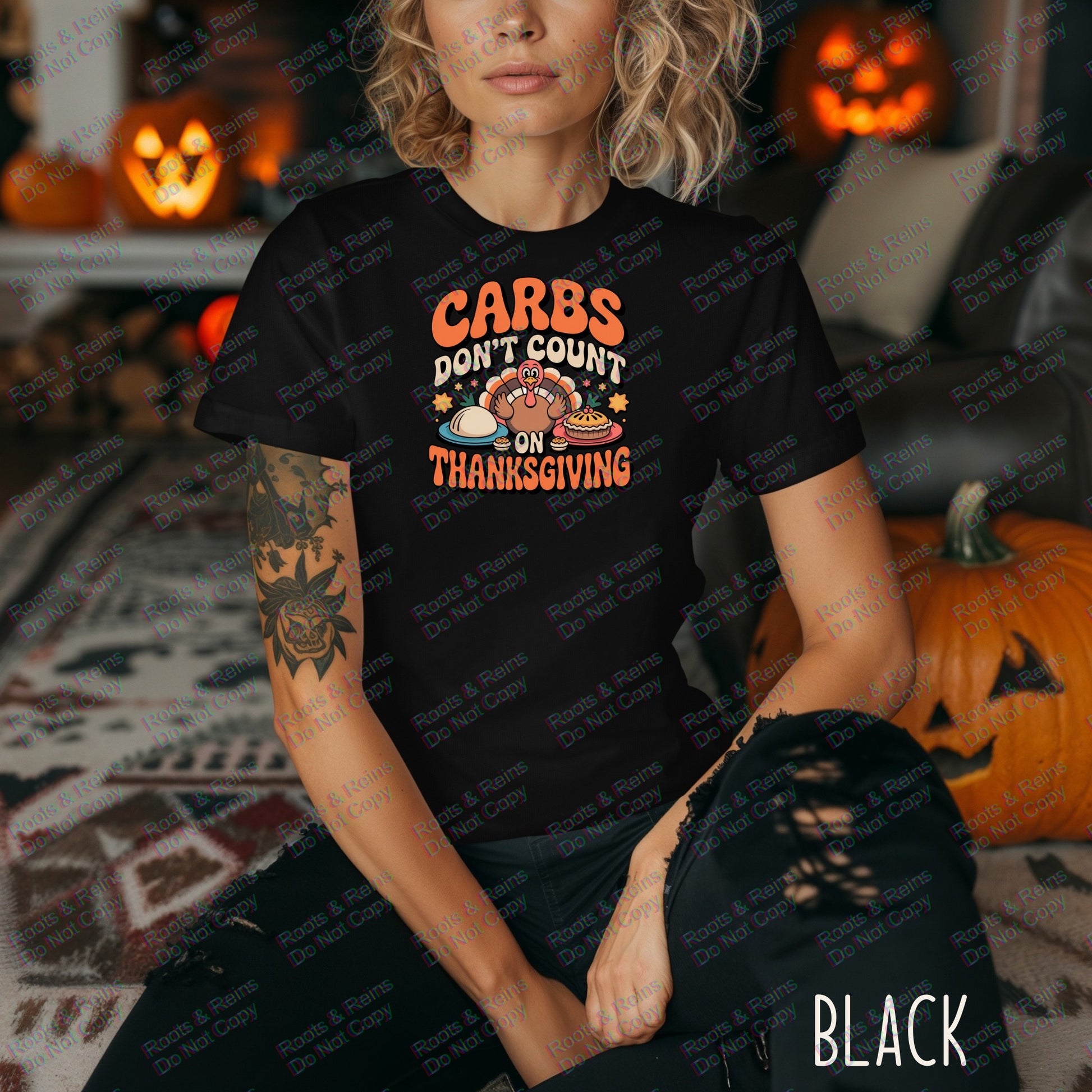 Celebrate the ultimate cheat day in style with the Carbs Don’t Count on Thanksgiving tee! This fun and festive design features a cheerful turkey surrounded by all the best holiday foods — mashed potatoes, pie, and rolls — reminding everyone that calories don’t exist when gratitude (and gravy) are involved.
