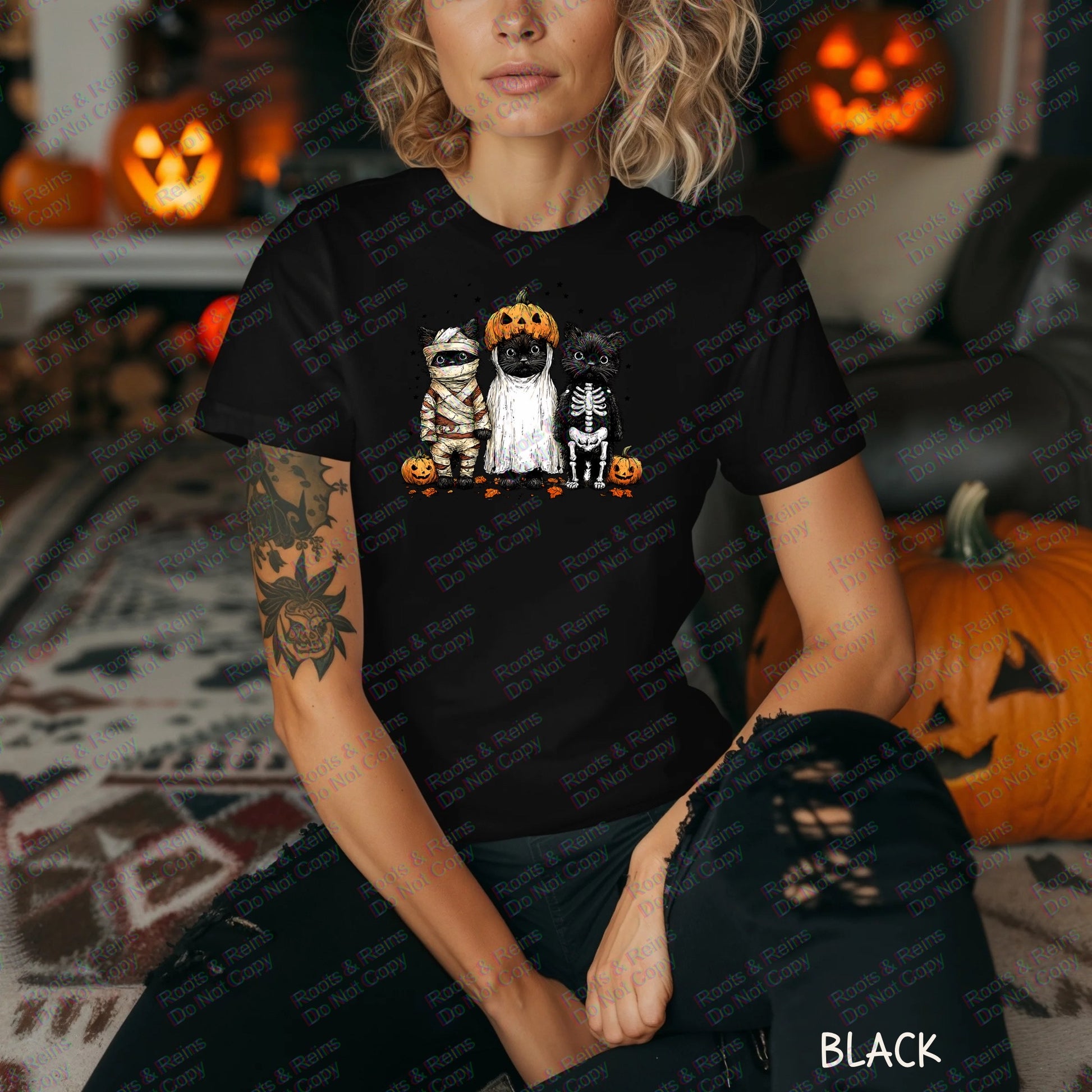 Step into spooky season with the Creepy Cute Kittens graphic tee! Printed on the soft and stylish Gildan 64000 Softstyle T-shirt, this design features three adorable black cats dressed for Halloween — a mummy, a ghost with a pumpkin head, and a skeleton kitty. Surrounded by stars, pumpkins, and autumn leaves, this shirt is the purr-fect mix of cute and creepy for cat lovers and Halloween fans alike.