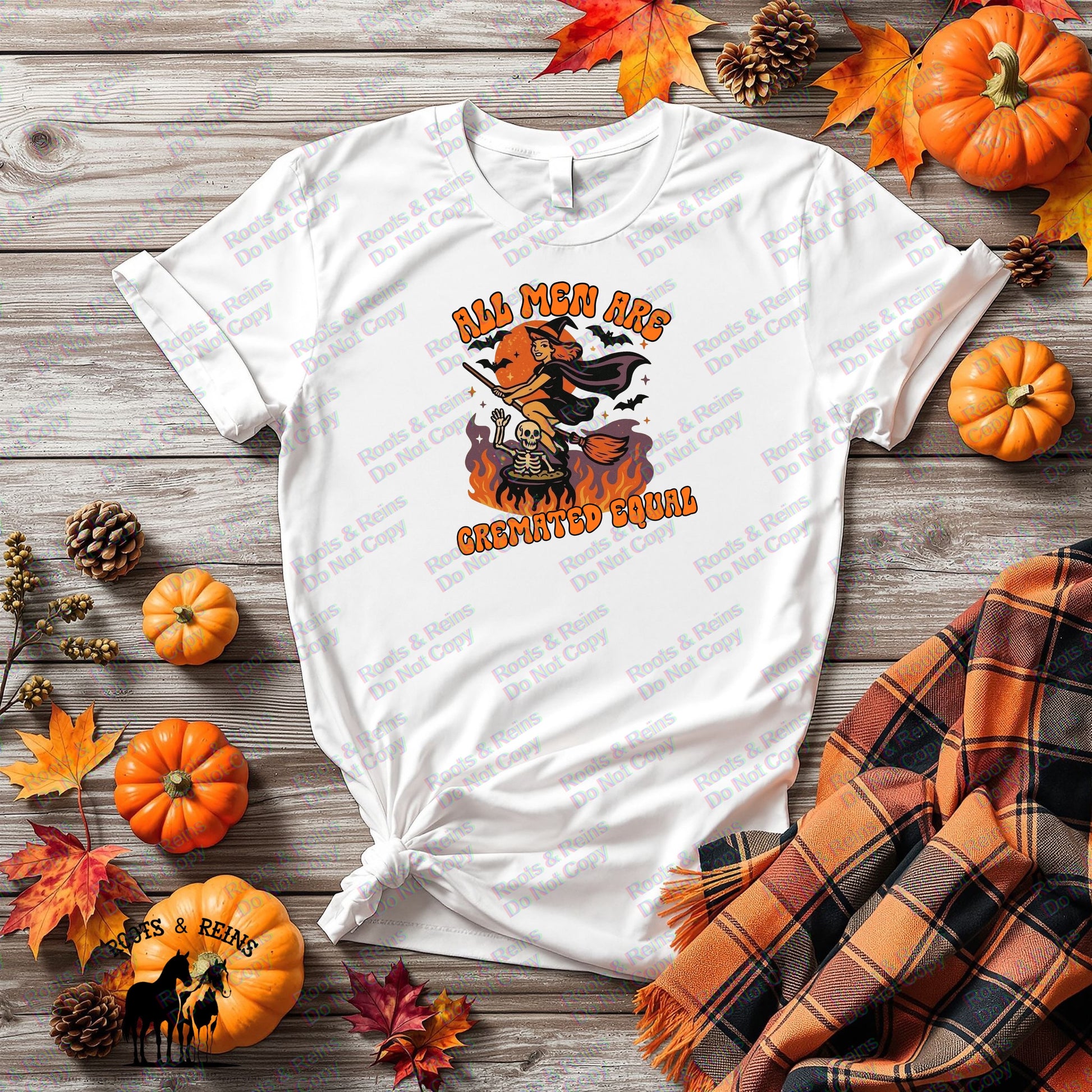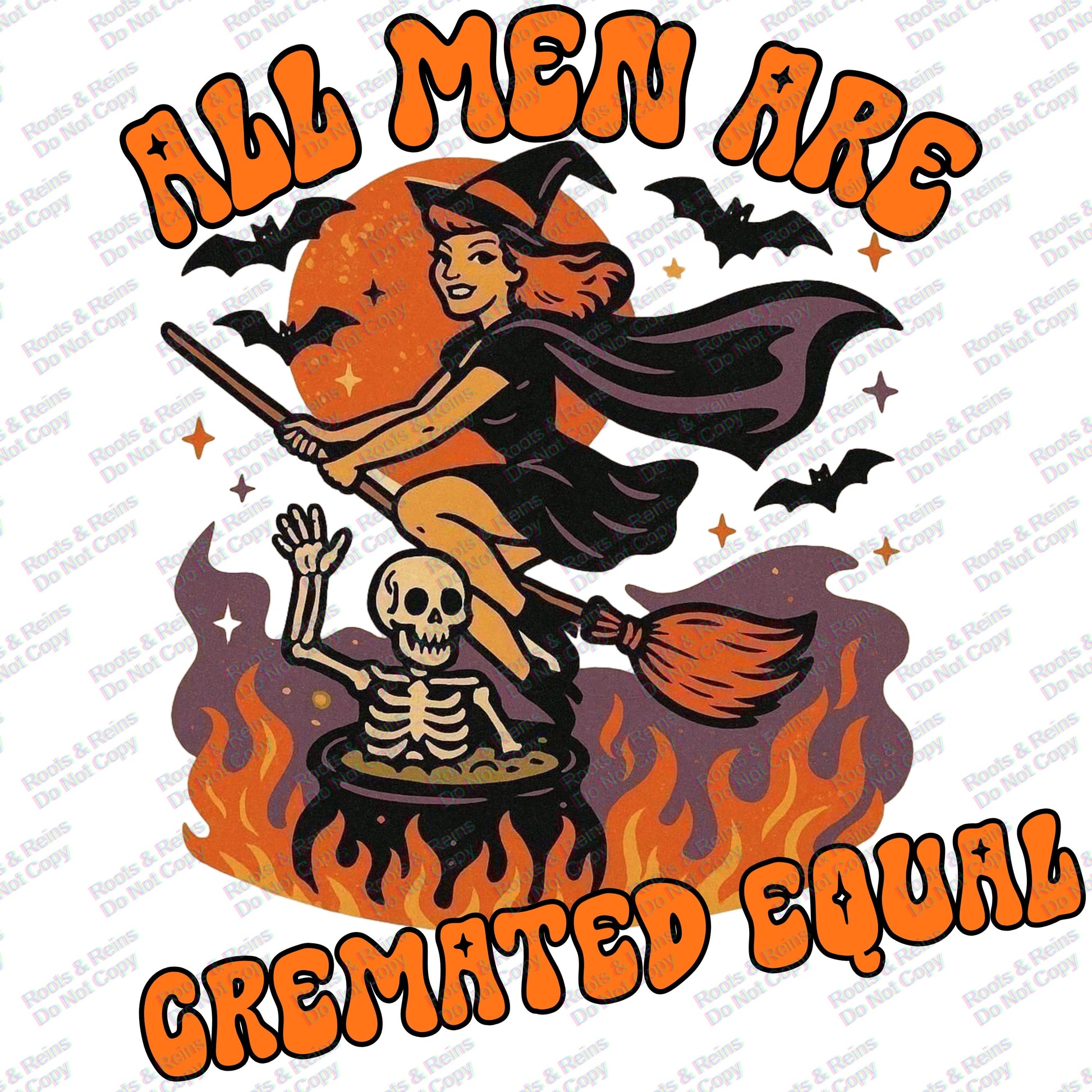 Add a wickedly funny twist to your Halloween projects with this bold “All Men Are Cremated Equal” digital design! Featuring a flying witch above flames with a skeleton rising from the fire, this spooky and humorous artwork is perfect for creating t-shirts, mugs, posters, party décor, and more. With its retro Halloween vibe and bold orange tones, it’s sure to stand out in your seasonal creations.