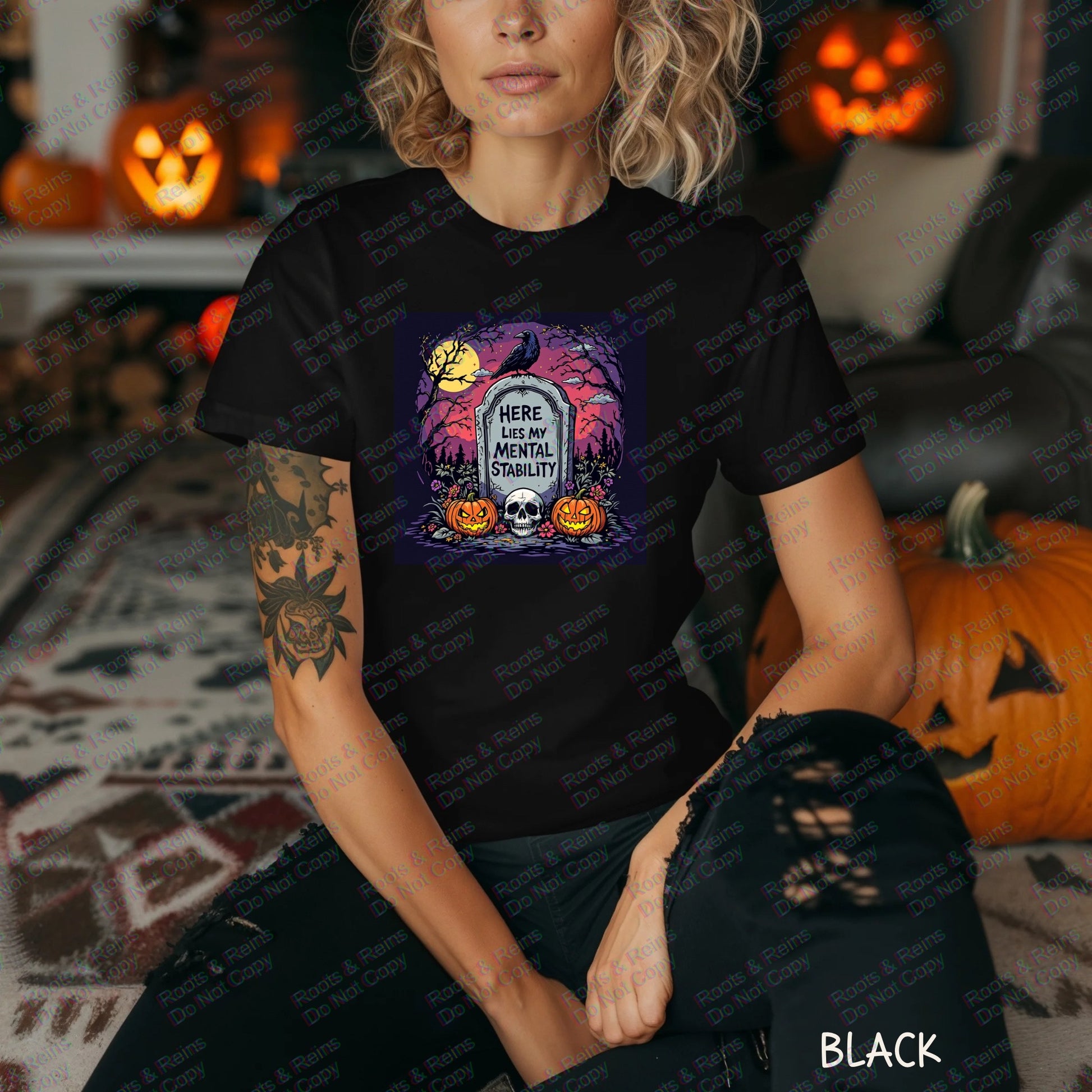 Show off your dark sense of humor this spooky season with Graveyard of Sanity! This Halloween design features a tombstone engraved with “Here Lies My Mental Stability,” framed by glowing jack-o’-lanterns, a skull, eerie trees, and a raven perched on top under a full moon. Perfect for a sarcastic Halloween shirt, dark humor tee, or snarky fall graphic, this design mixes creepy vibes with relatable wit. Great for Halloween parties, haunted houses, or everyday spooky season wear.