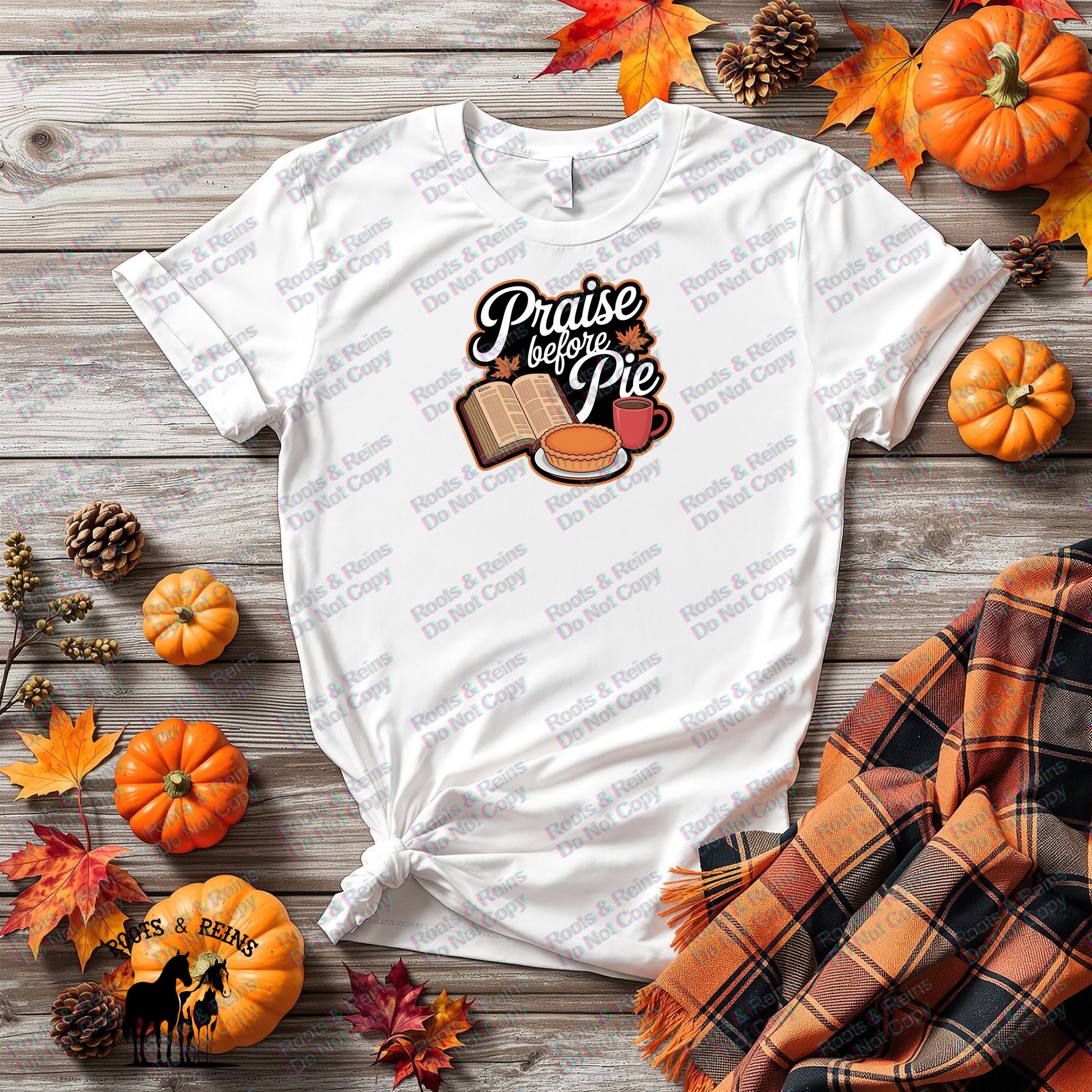 Bring faith and gratitude together this Thanksgiving with the “Praise Before Pie” digital design! Featuring an open Bible, a warm slice of pumpkin pie, a cozy cup of coffee, and falling autumn leaves, this heartwarming graphic is perfect for faith-based holiday projects. Use it to create t-shirts, mugs, kitchen towels, or wall art that remind everyone to give thanks before digging in!
