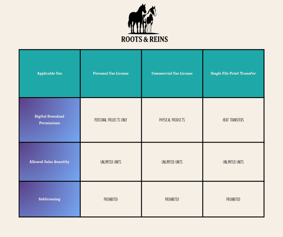 This license grants you permission to purchase and use one specific Roots & Reins digital design for the creation and sale of heat transfers, sublimation transfers, or screenprint transfers. This option is ideal for sellers who wish to offer ready-to-press transfers to their own customers without investing in a full commercial license.