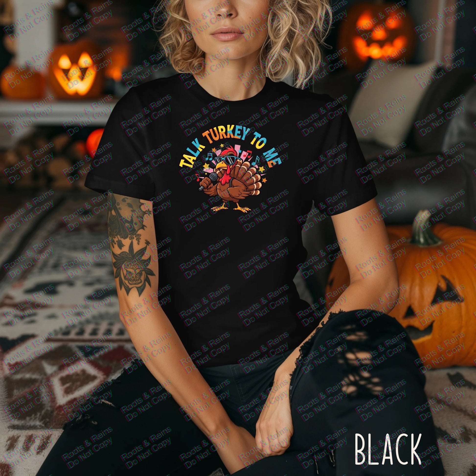 Turn up the Thanksgiving fun with the Talk Turkey to Me tee! This playful design features a cool cartoon turkey rocking shades, holding a microphone, and surrounded by colorful music notes and stars — ready to drop some holiday beats. It’s the perfect blend of humor and festive flair for anyone who loves a good laugh (and a great feast).