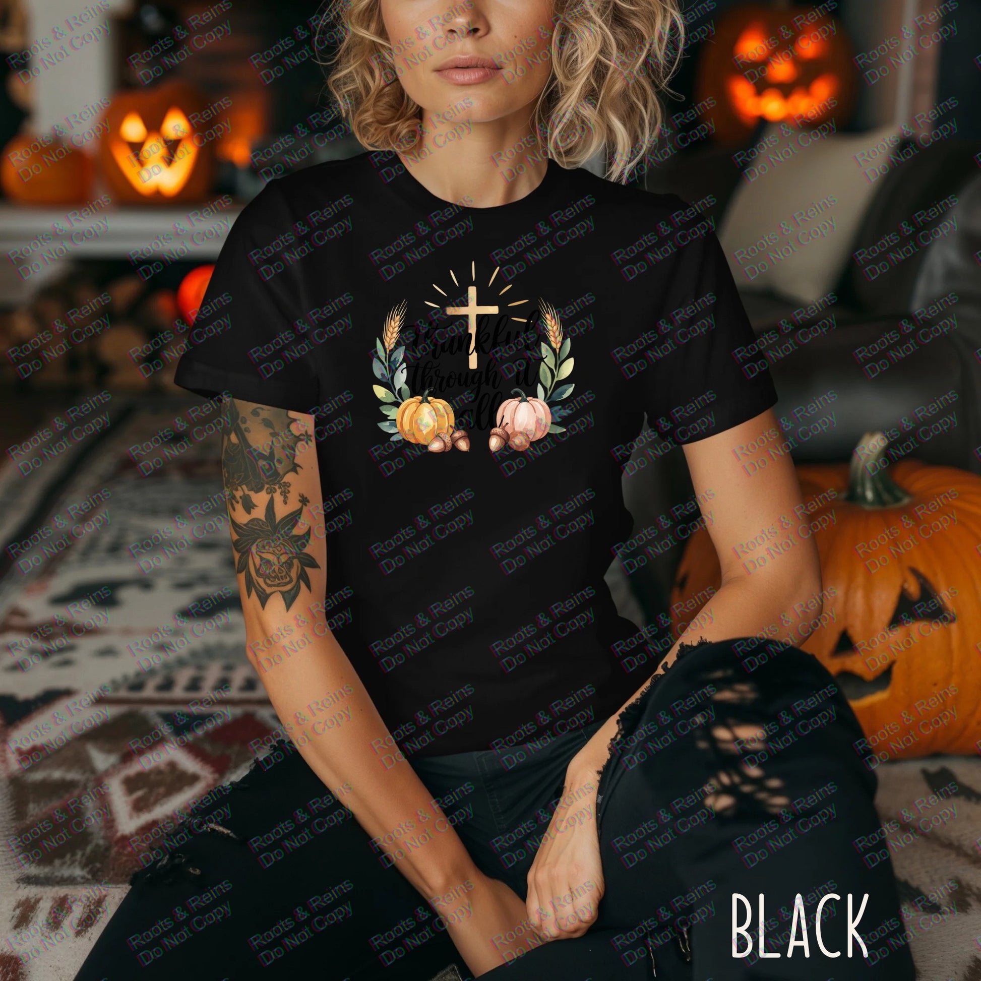 Faith and gratitude shine bright in the Thankful Through It All tee. This beautifully designed shirt features a radiant golden cross surrounded by soft watercolor pumpkins, acorns, and wheat sprigs — a gentle reminder to stay grateful in every season. Perfect for fall, Thanksgiving, or any day you want to share a little light and love.