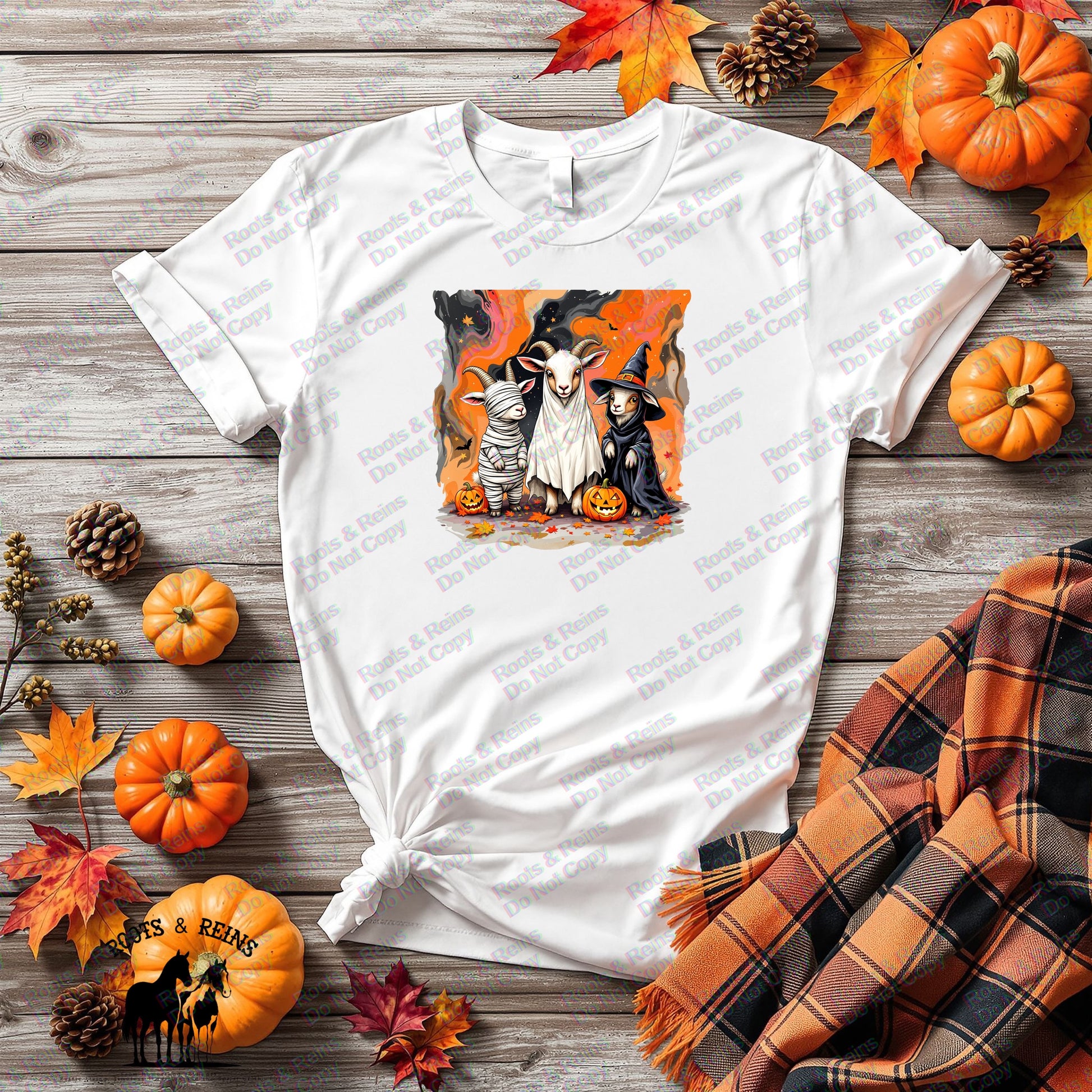 Get into the Halloween spirit with this adorable farm animal Halloween digital design! Featuring three goats dressed in classic spooky costumes—a mummy, a ghost, and a witch—this festive artwork is perfect for your seasonal creations. With pumpkins, autumn leaves, and a swirling orange-and-black background, this design adds a fun and whimsical touch to t-shirts, posters, party invitations, and more.