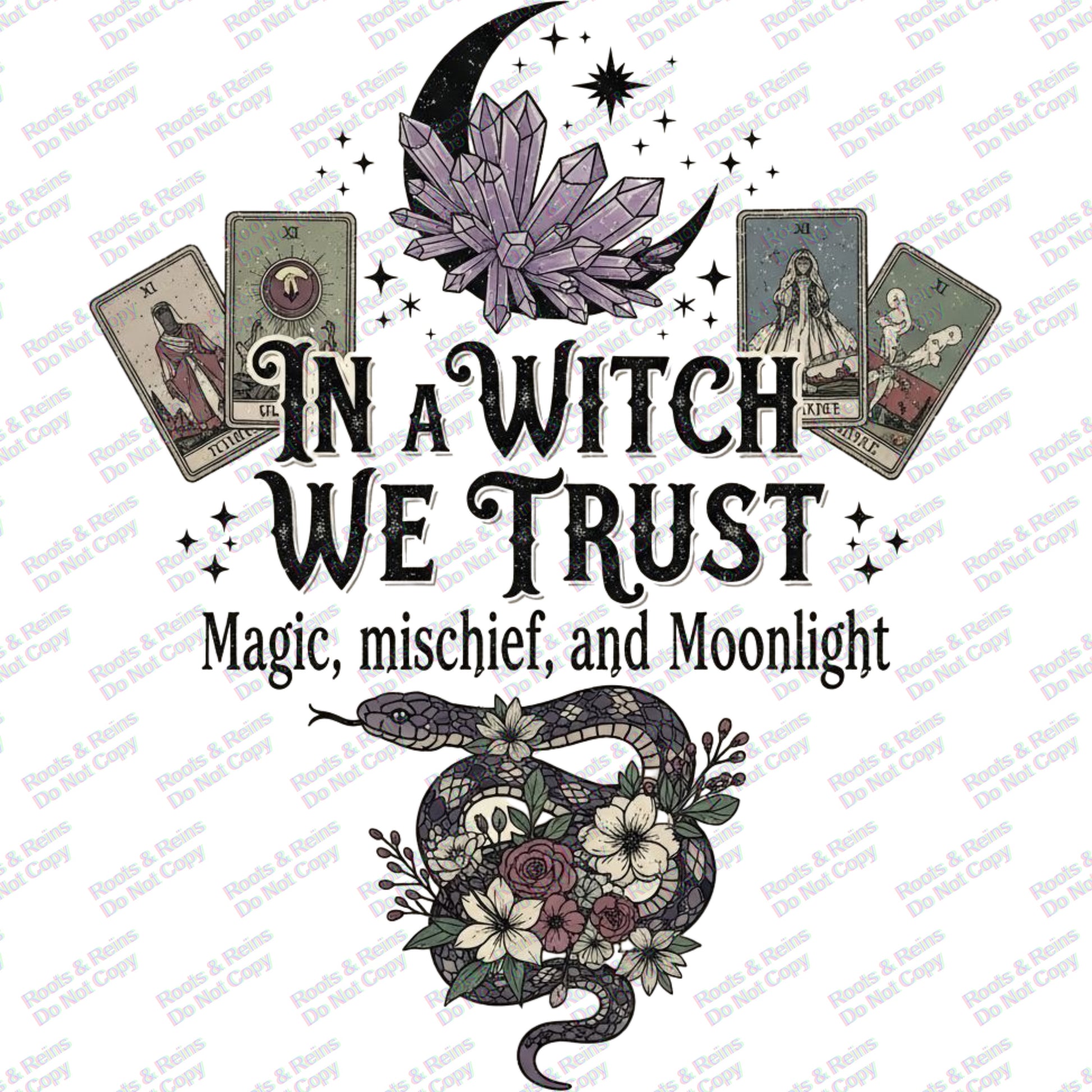 Add a touch of mysticism and moonlight to your creations with this enchanting “In a Witch We Trust” digital design. Featuring tarot cards, a crescent moon with crystals, a coiled serpent wrapped in flowers, and magical typography, this design beautifully blends witchy symbolism with gothic charm. Perfect for t-shirts, tote bags, posters, stickers, and more, it’s ideal for anyone who loves witchcraft, tarot, and celestial-inspired art.